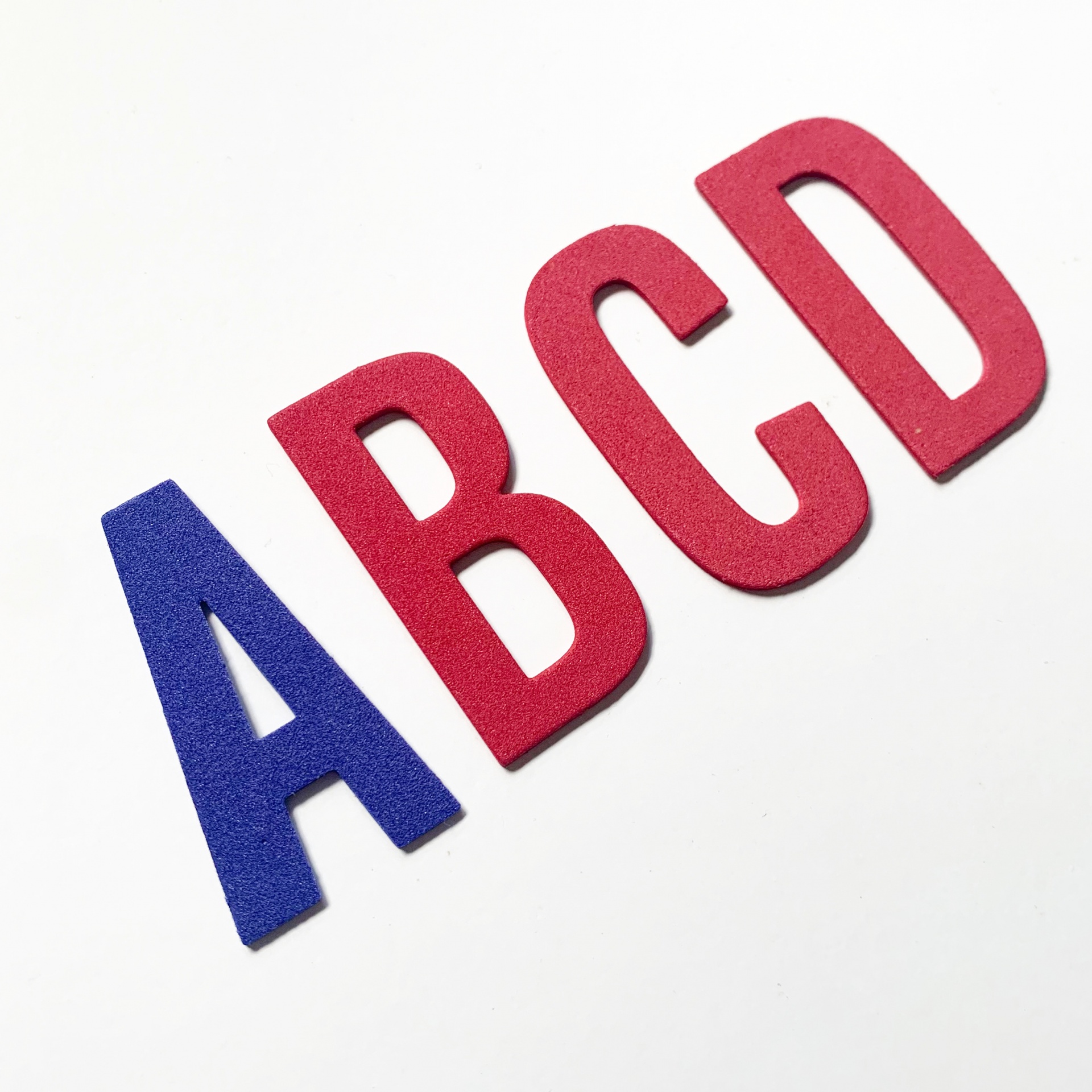 Letras em espuma azul e vermelha sobre fundo branco