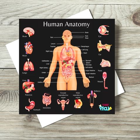 Quadro educativo de anatomia humana com diagrama do corpo e órgãos internos, etiquetas em inglês, fundo preto, superfície de madeira e envelope branco.