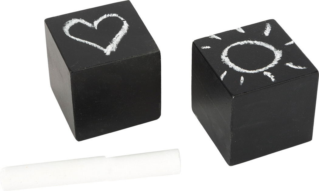 Dois cubos pretos tipo quadro de ardósia com desenhos a giz, coração e sol, com giz branco ao lado