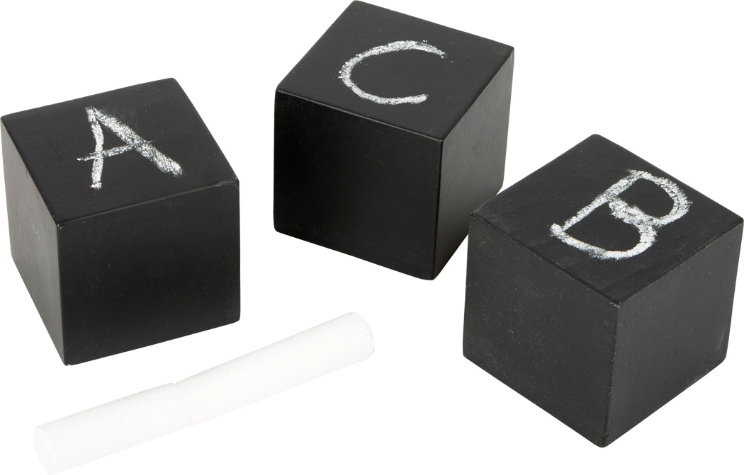 cubos pretos com letras A, B, C em giz e um pedaço de giz branco