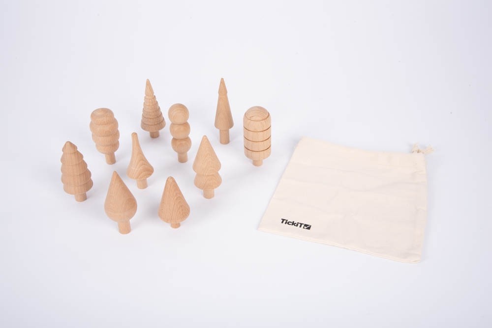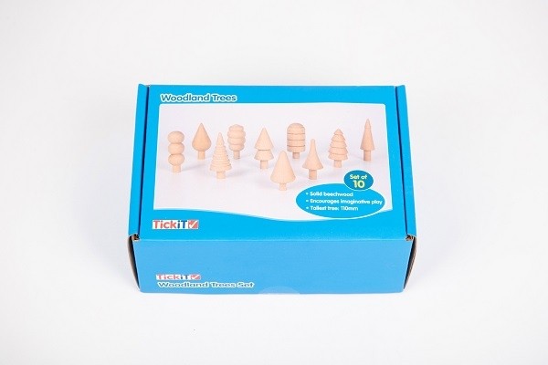 Caixa azul com 10 árvores de madeira natural modelo Woodland Trees