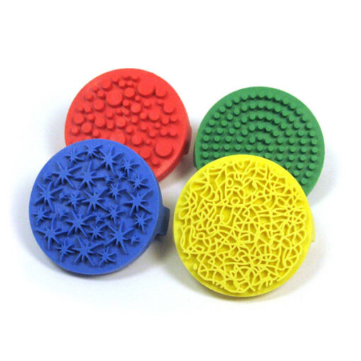 Quatro carimbos circulares coloridos com padrões texturizados diferentes.