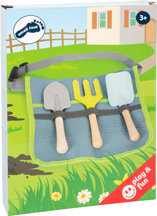 Avental infantil para jardinagem com ferramentas de madeira e metal