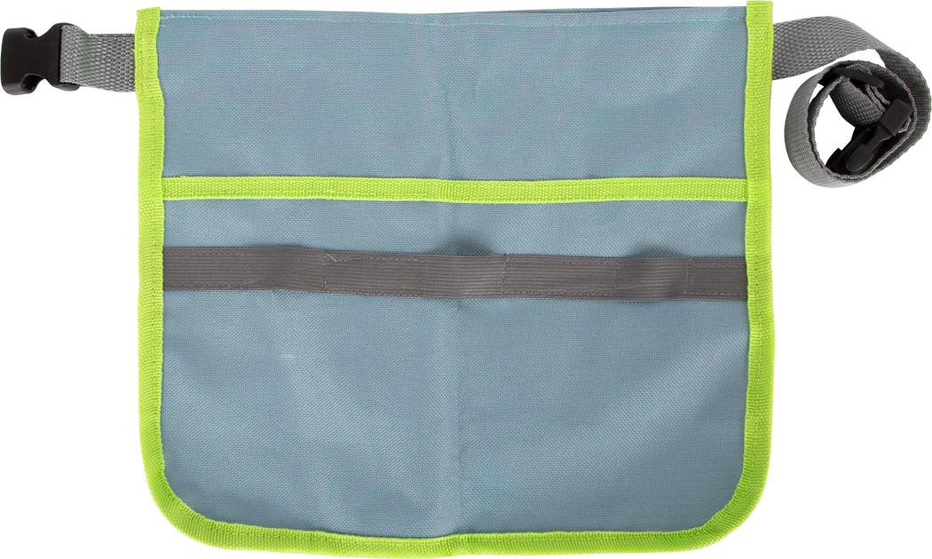 Bolsa ou avental cinzento com bordas verdes e faixas refletoras