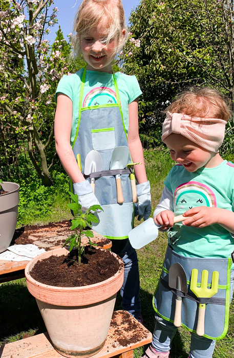 Duas crianças com aventais e ferramentas de jardinagem em ambiente ao ar livre