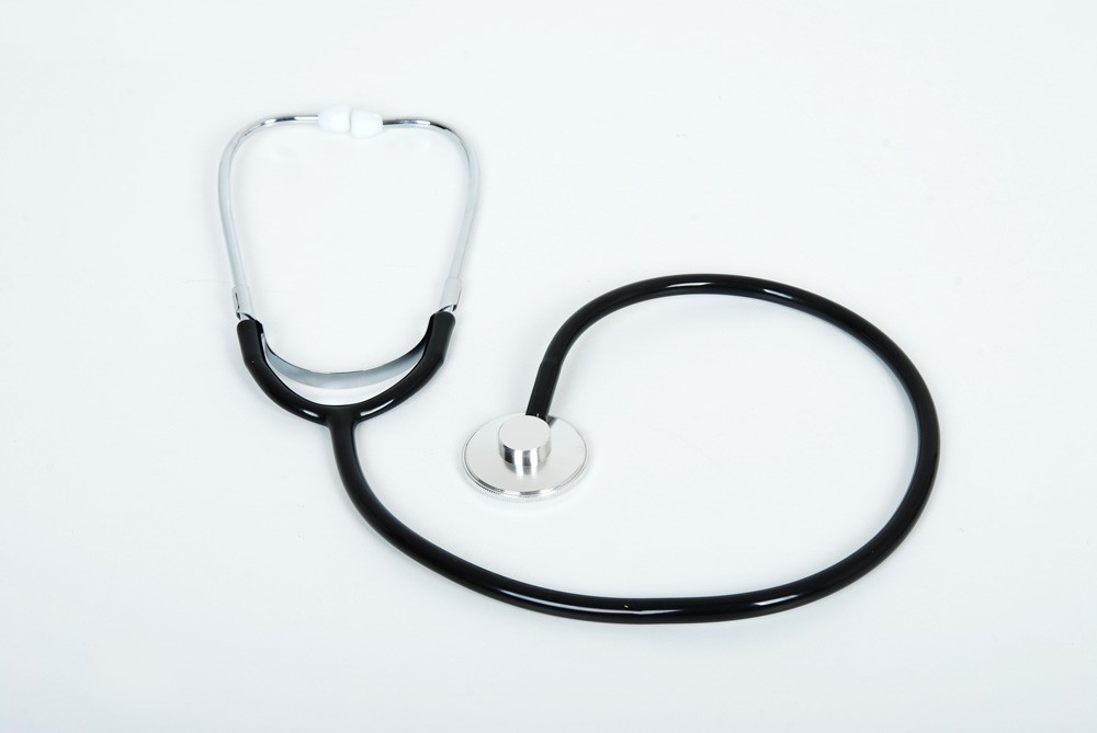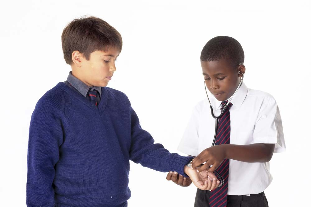 Duas crianças em uniformes escolares com estetoscópio fundo branco