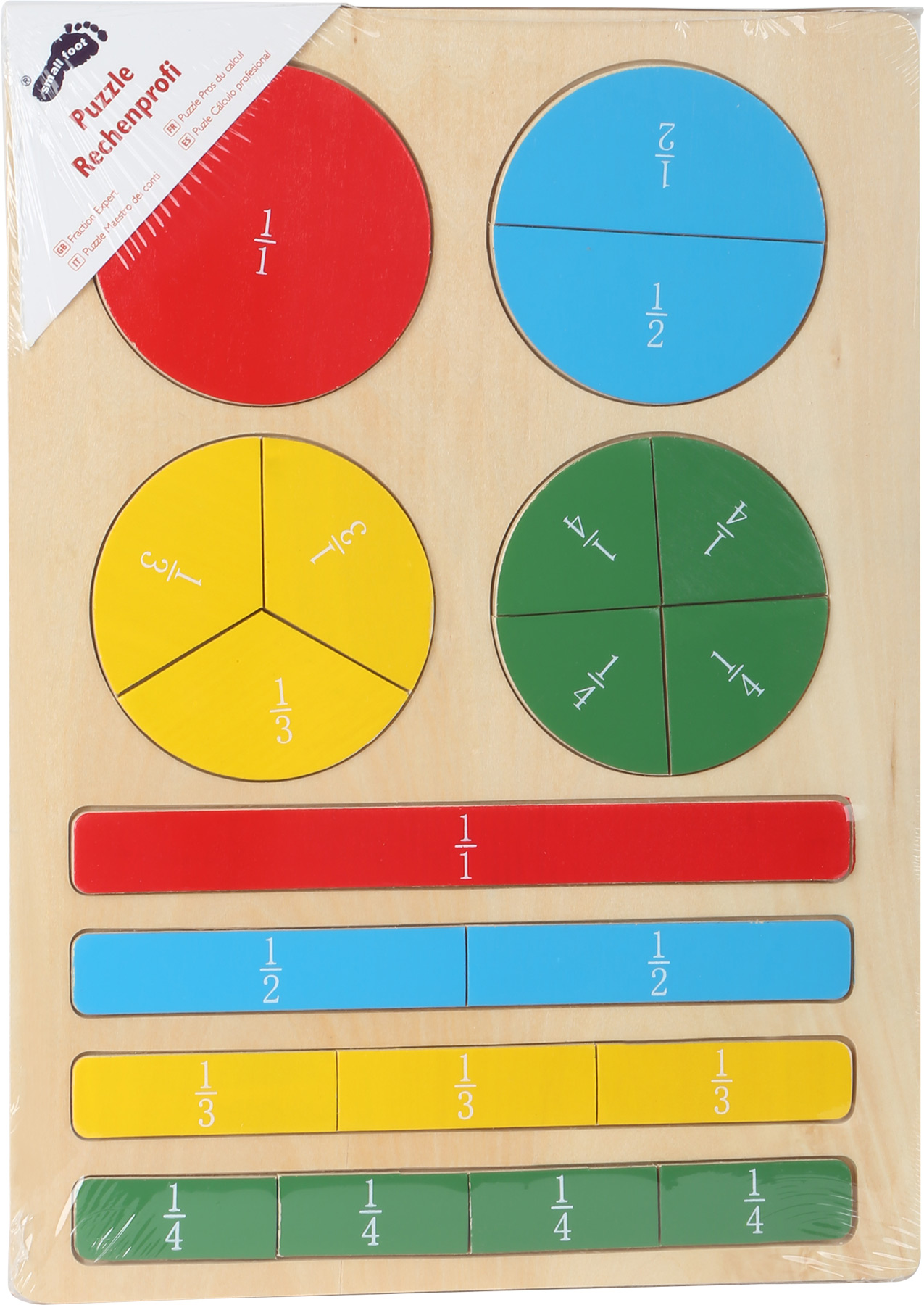 Puzzle de frações colorido em madeira com peças circulares e retangulares, com texto Puzzle Rechenprofi