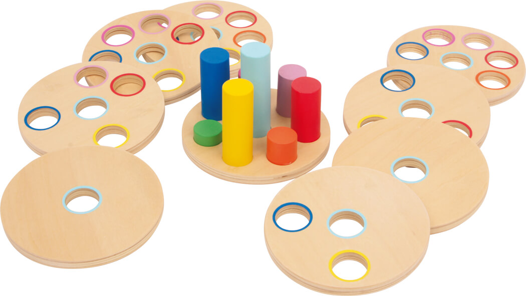 Jogo educativo de madeira com discos e cilindros coloridos