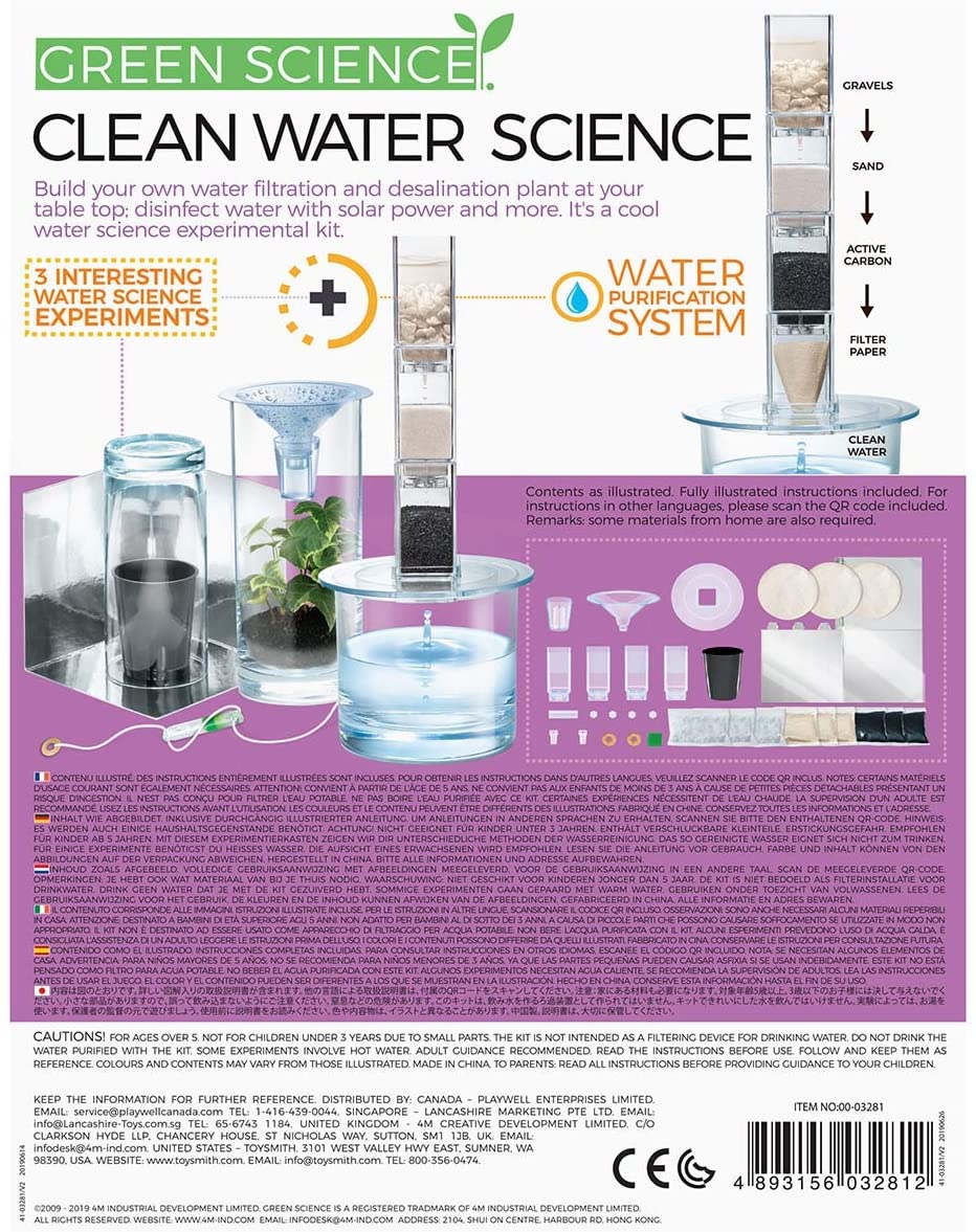 Kit educativo para filtração de água CLEAN WATER SCIENCE na caixa com imagens do produto e instruções.