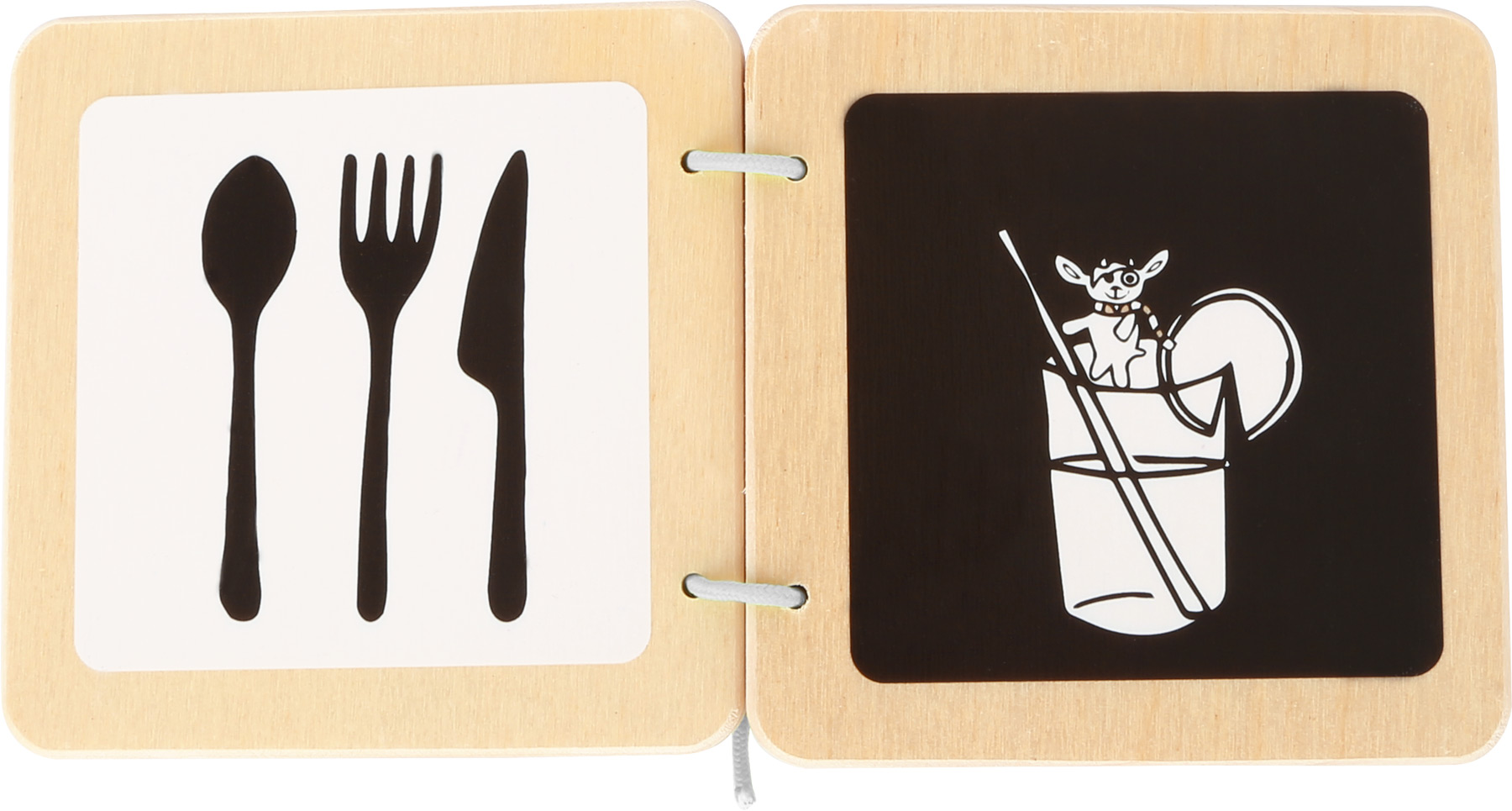 Livro infantil em madeira com ilustrações de talheres e bebida com rato.