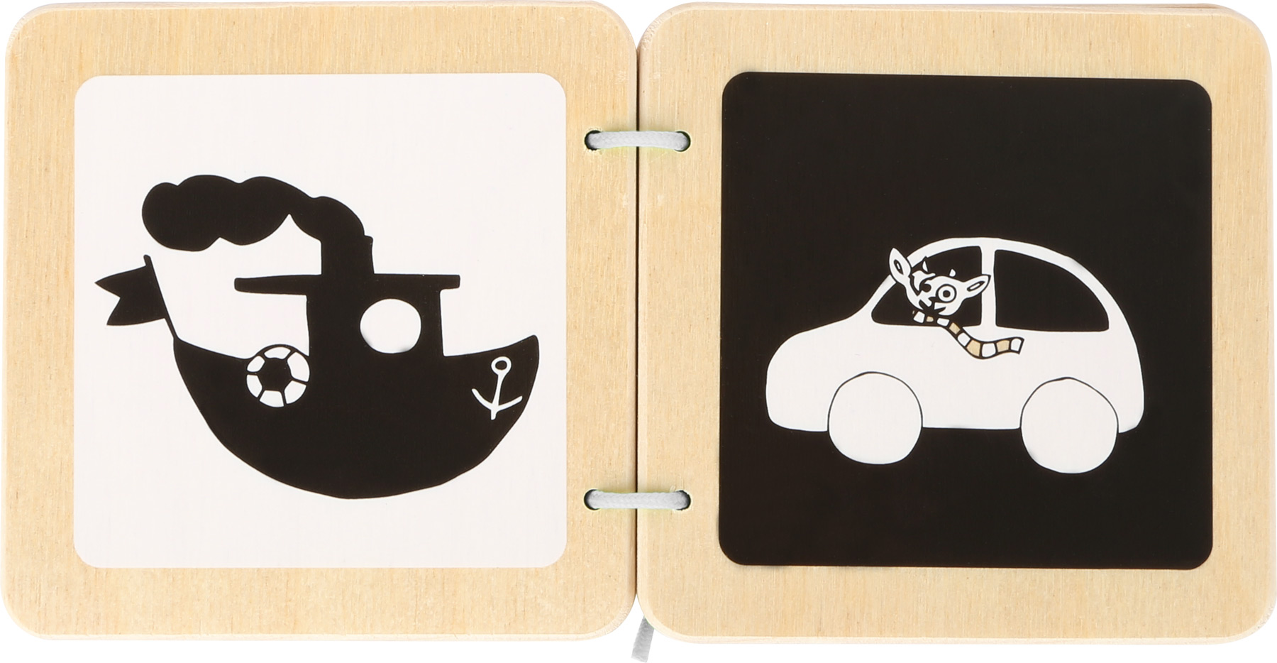 Livro de madeira para crianças com desenhos a preto e branco de um barquinho e um carro.
