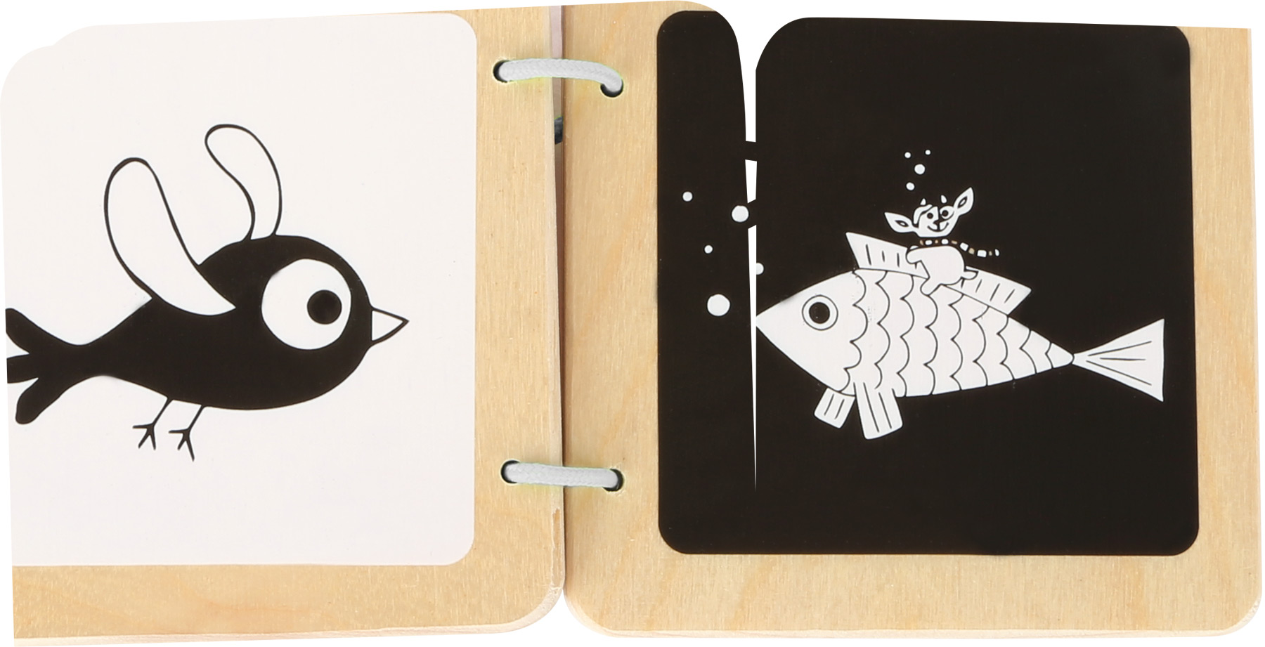 Livro infantil em madeira com ilustrações em preto e branco de pássaro e peixe