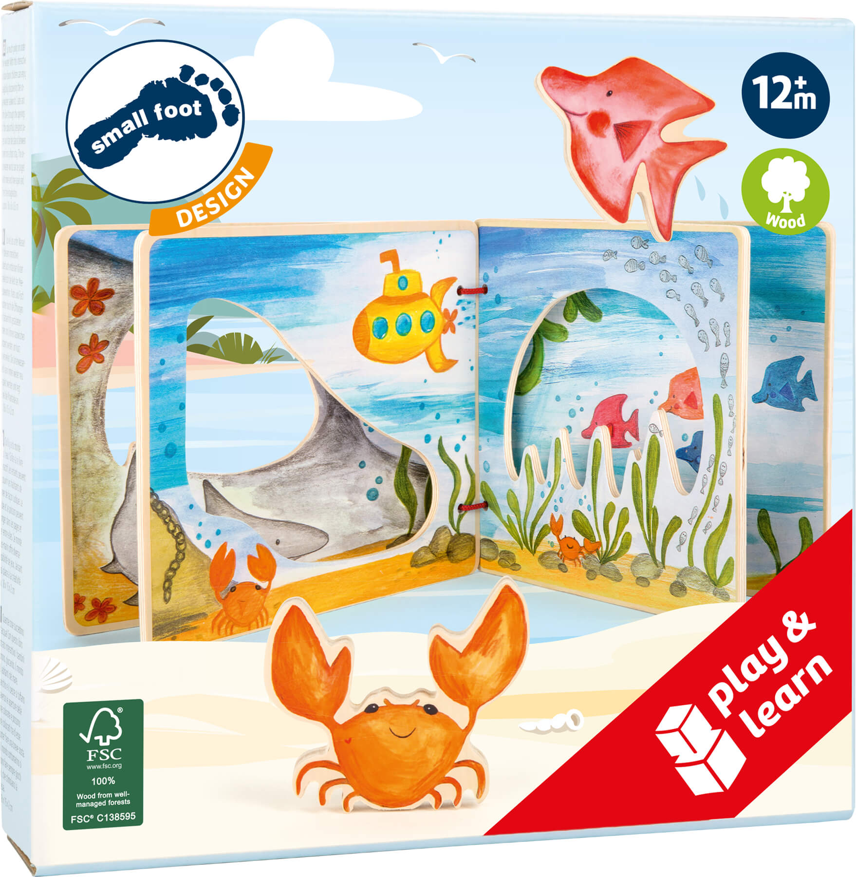 Livro interactivo em madeira certificada FSC®. Para os pais darem asas à imaginação contando as aventuras de um caranguejo e o seu amigo peixe.