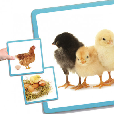 Jogo de associação com 20 cartões que se dividem por 6 ciclos de vida diferentes. Com imagens reais de grande tamanho.
