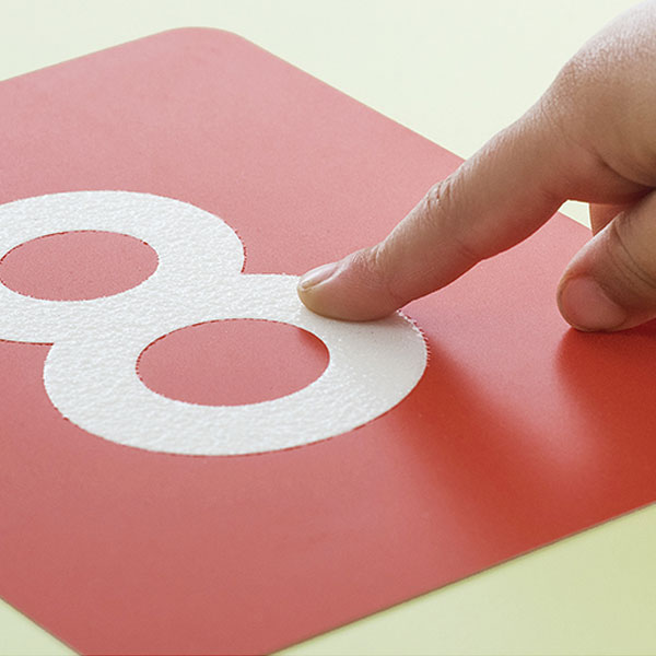 Placa vermelha com número 8 branco em relevo e dedo a tocar