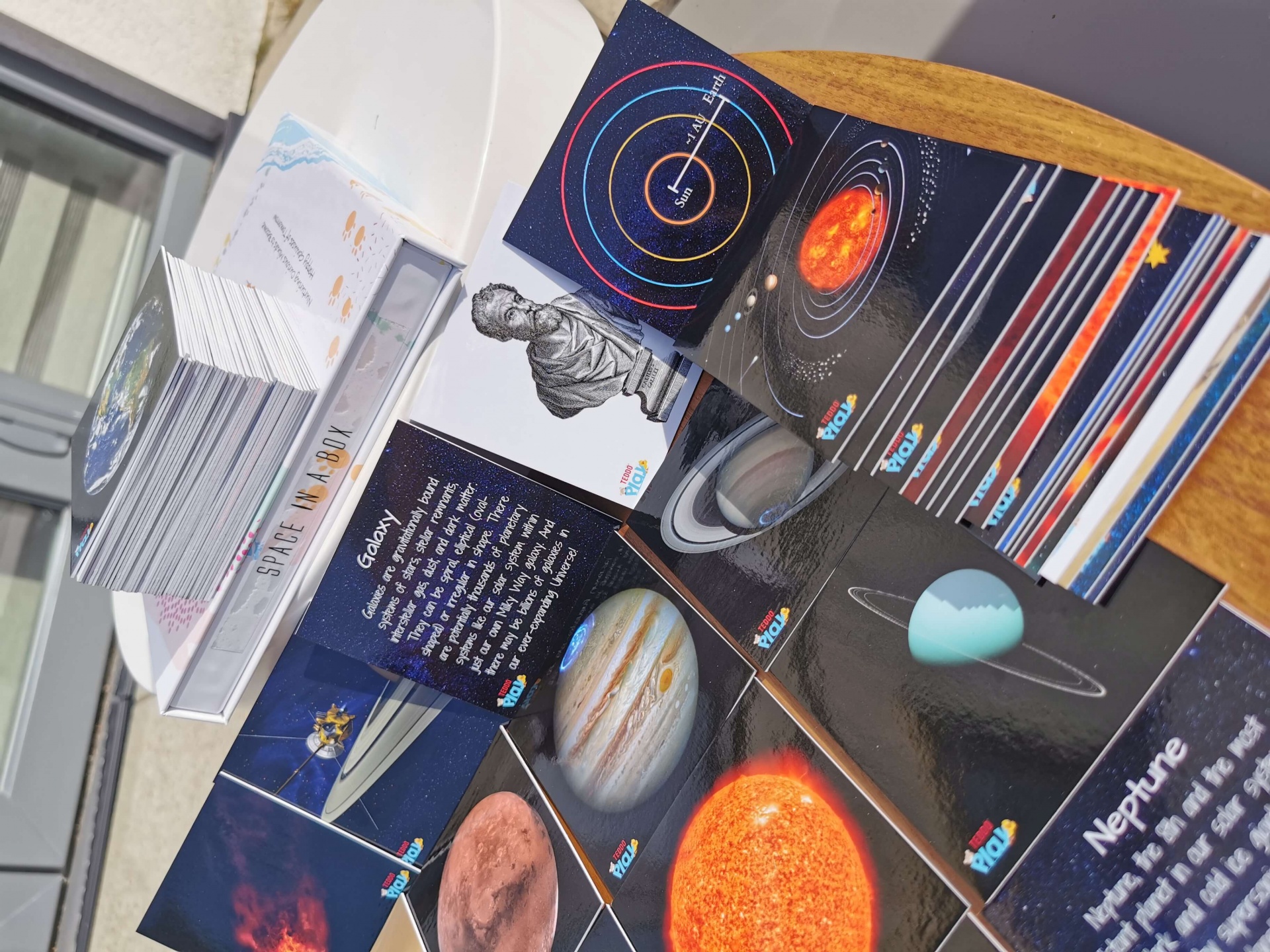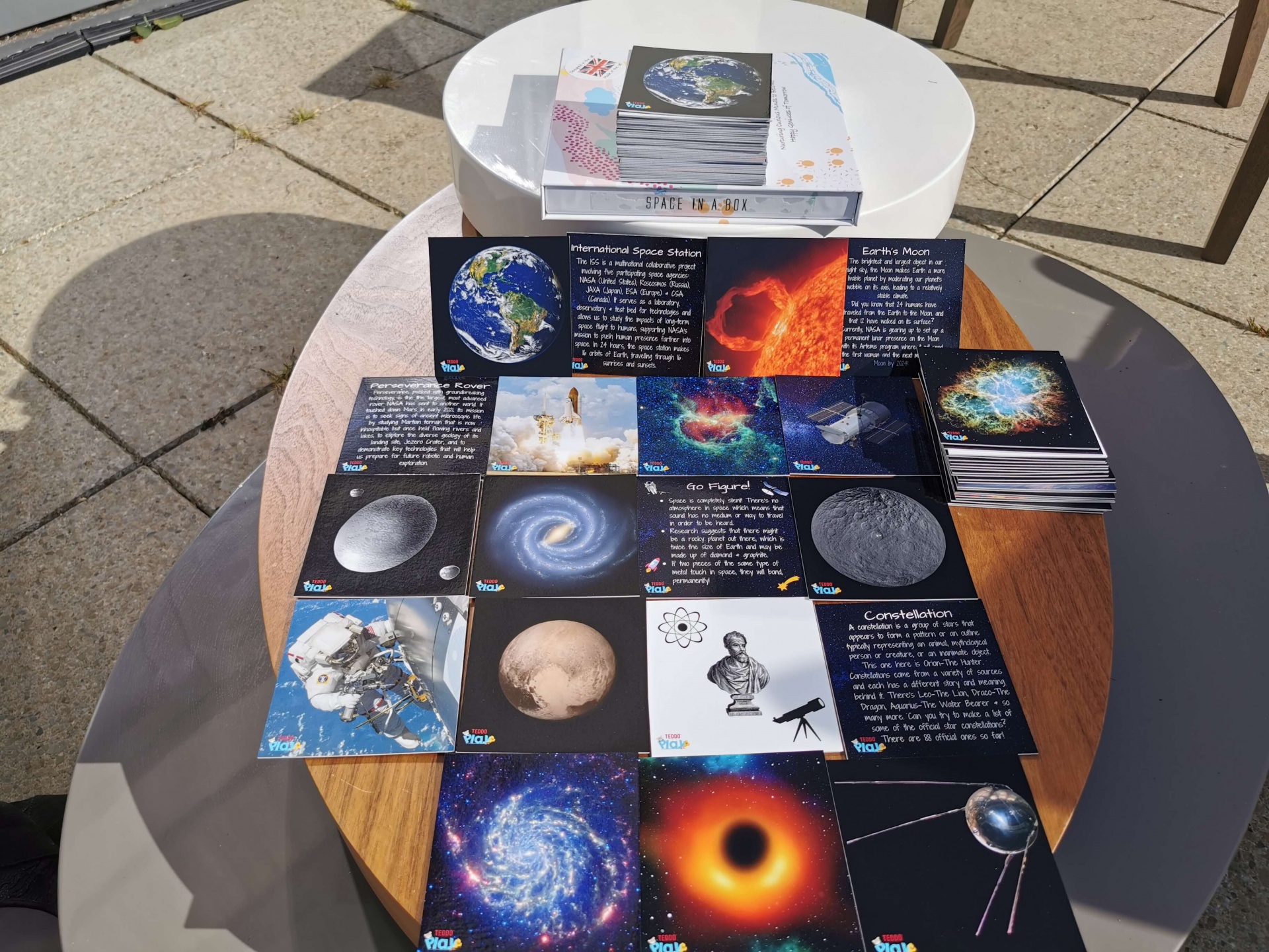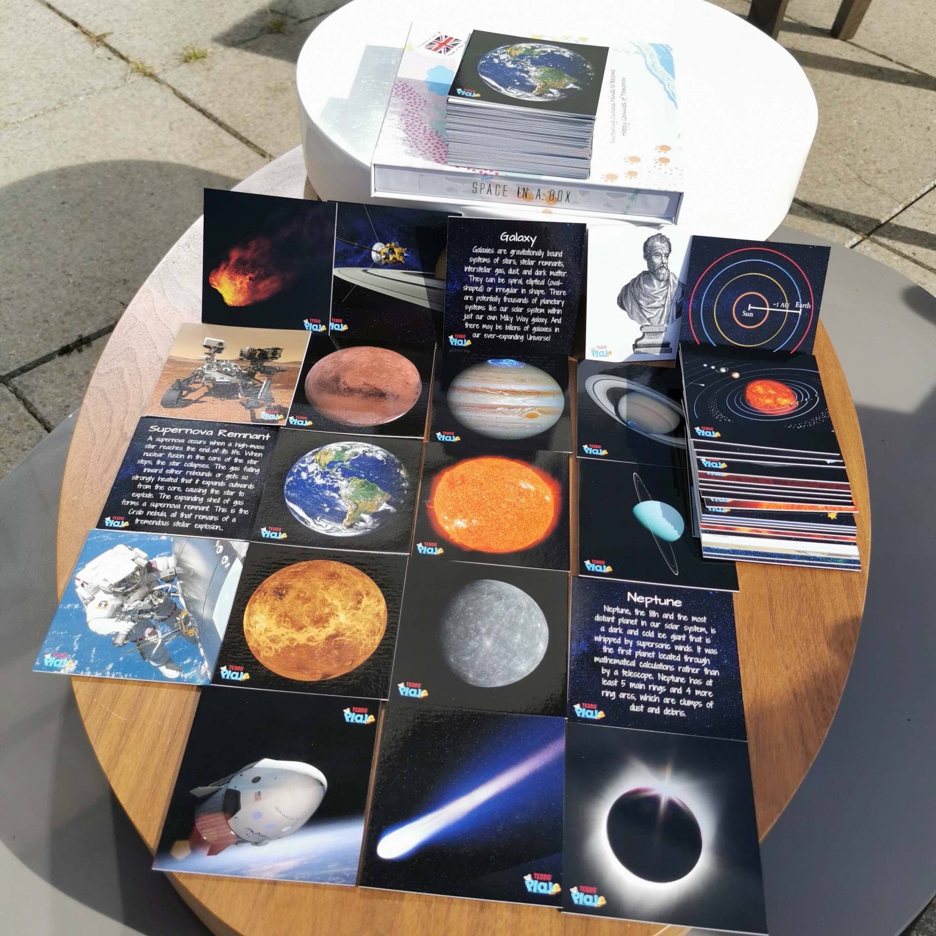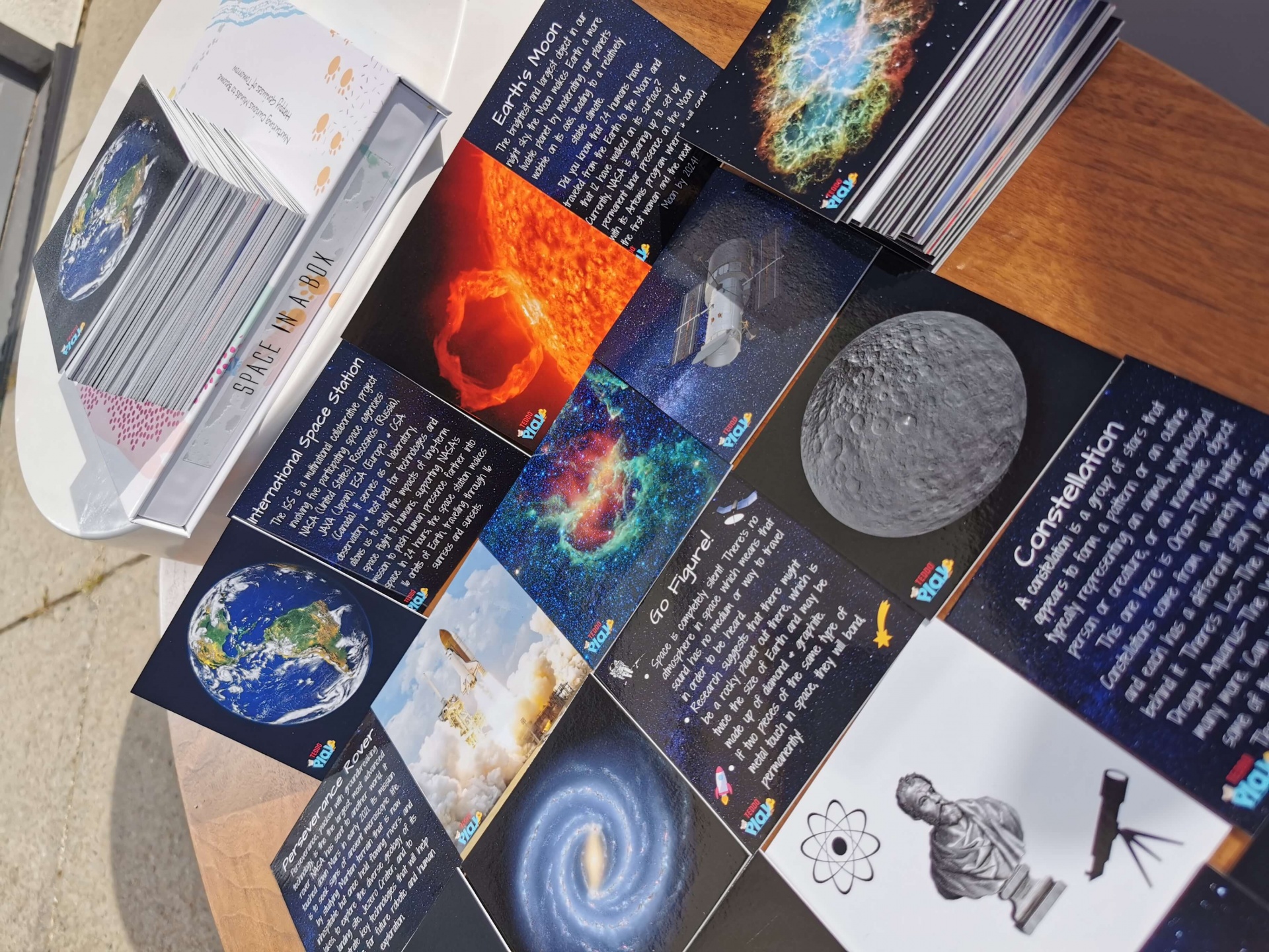 40 Cartões com imagens dos diversos elementos que compõem este tema. O Sol, 8 planetas, Luas, Asteroides, Meteoritos, Galaxias entre outras curiosidades. De um lado com uma imagem e no verso todas as informações importantes relativamente à imagem.