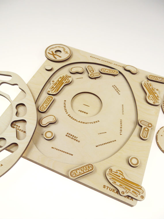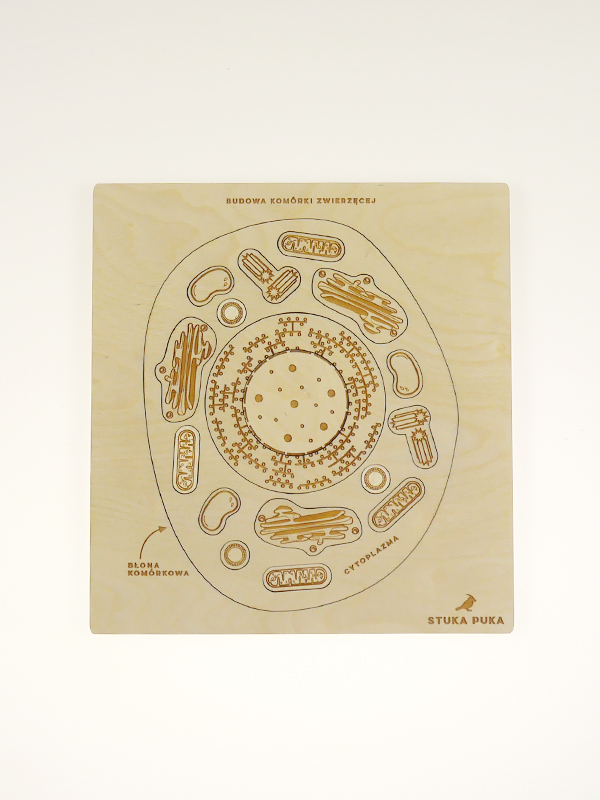 Puzzle educativo em madeira com desenho de célula animal e texto em polaco