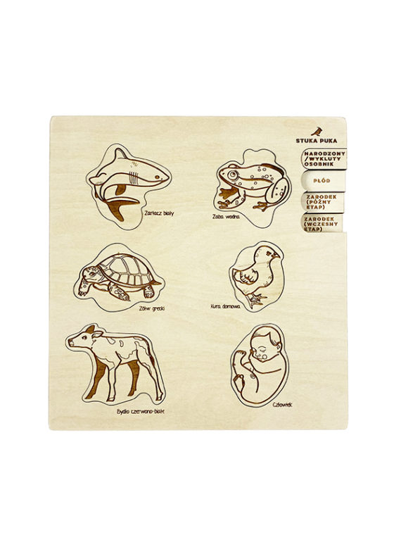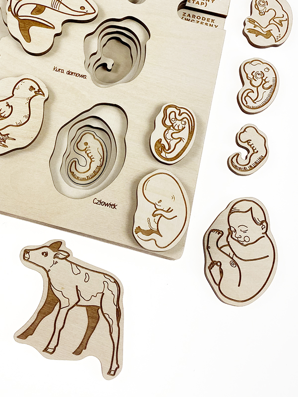 Puzzle educativo de madeira com desenhos de embriões, vaca e ave e texto em polaco