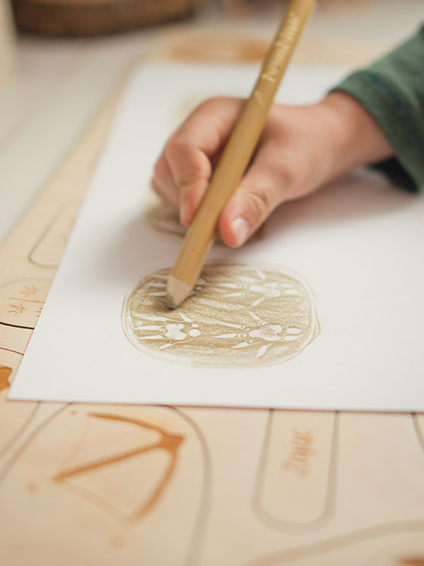 criança a brincar com tabuleiro de madeira numa mesa com brinquedos de madeira ao redor