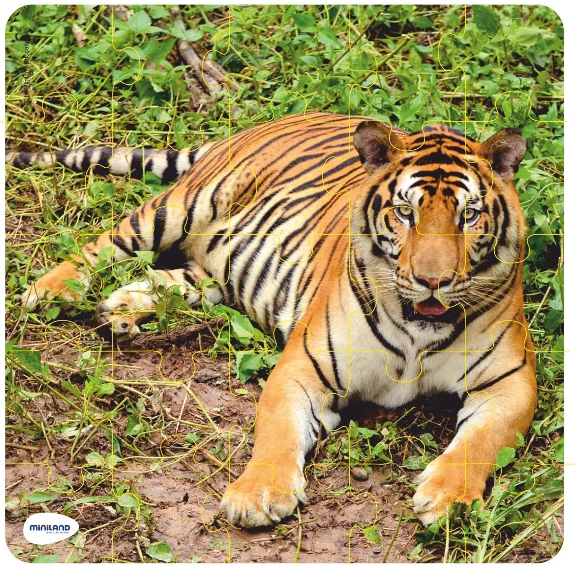 Três puzzles quadrados com imagens de um elefante, um panda e um tigre na natureza
