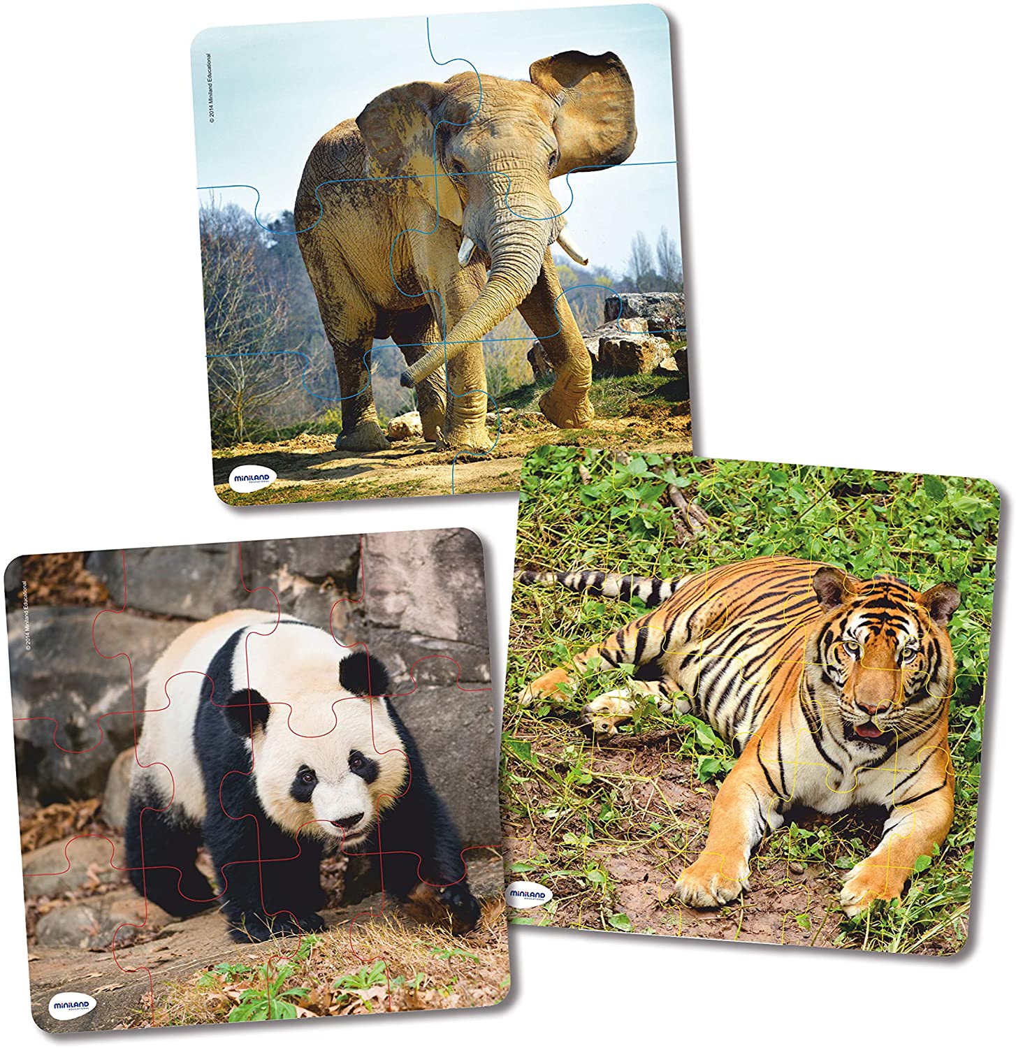 Três peças de puzzle com imagens de elefante, panda e tigre.