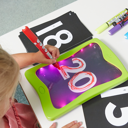 Criança usando lousa digital verde com luzes roxas para desenhar o número 20