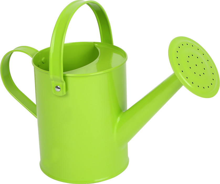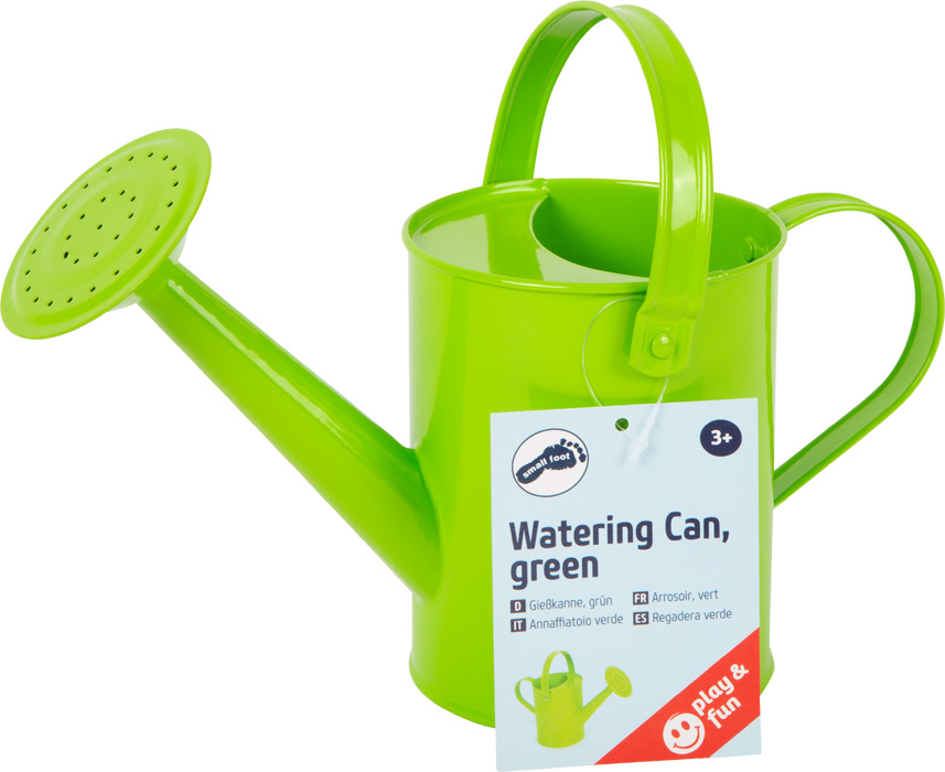Regador infantil verde claro com alça e bocal junto a silhueta de criança com escala de 20 cm