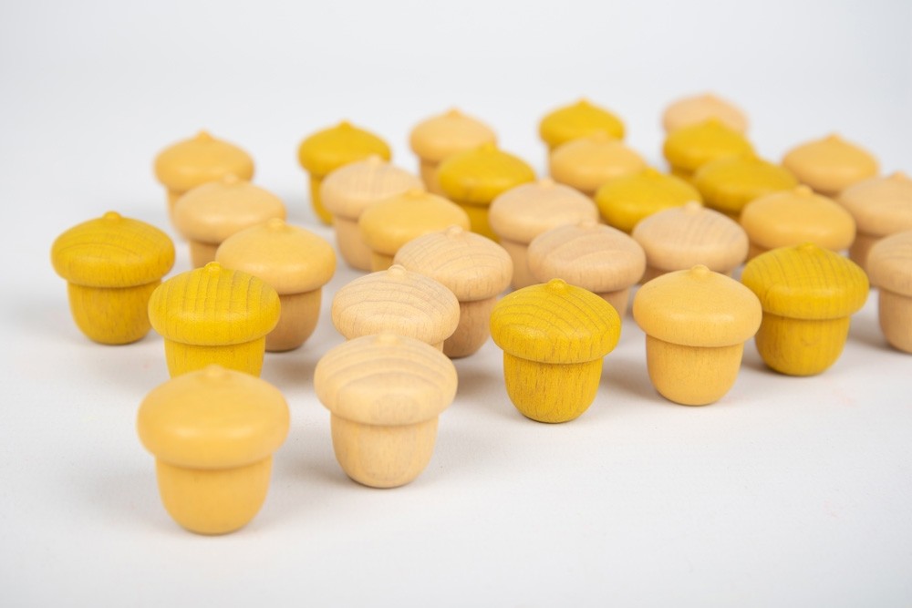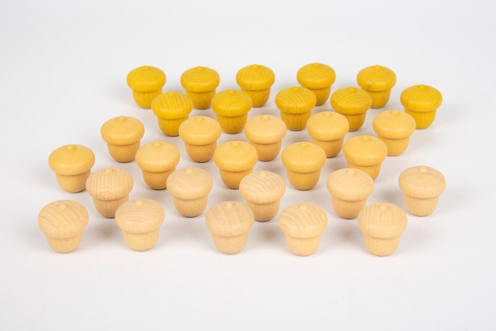 Conjunto de 30 peças soltas em madeira em 3 tons de amarelo.