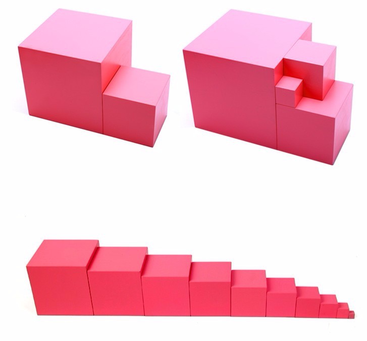 Torre Rosa Montessoriana composta por 10 cubos que diferem entre si 1cm. Inclui cubo de 1x1x1cm extra.